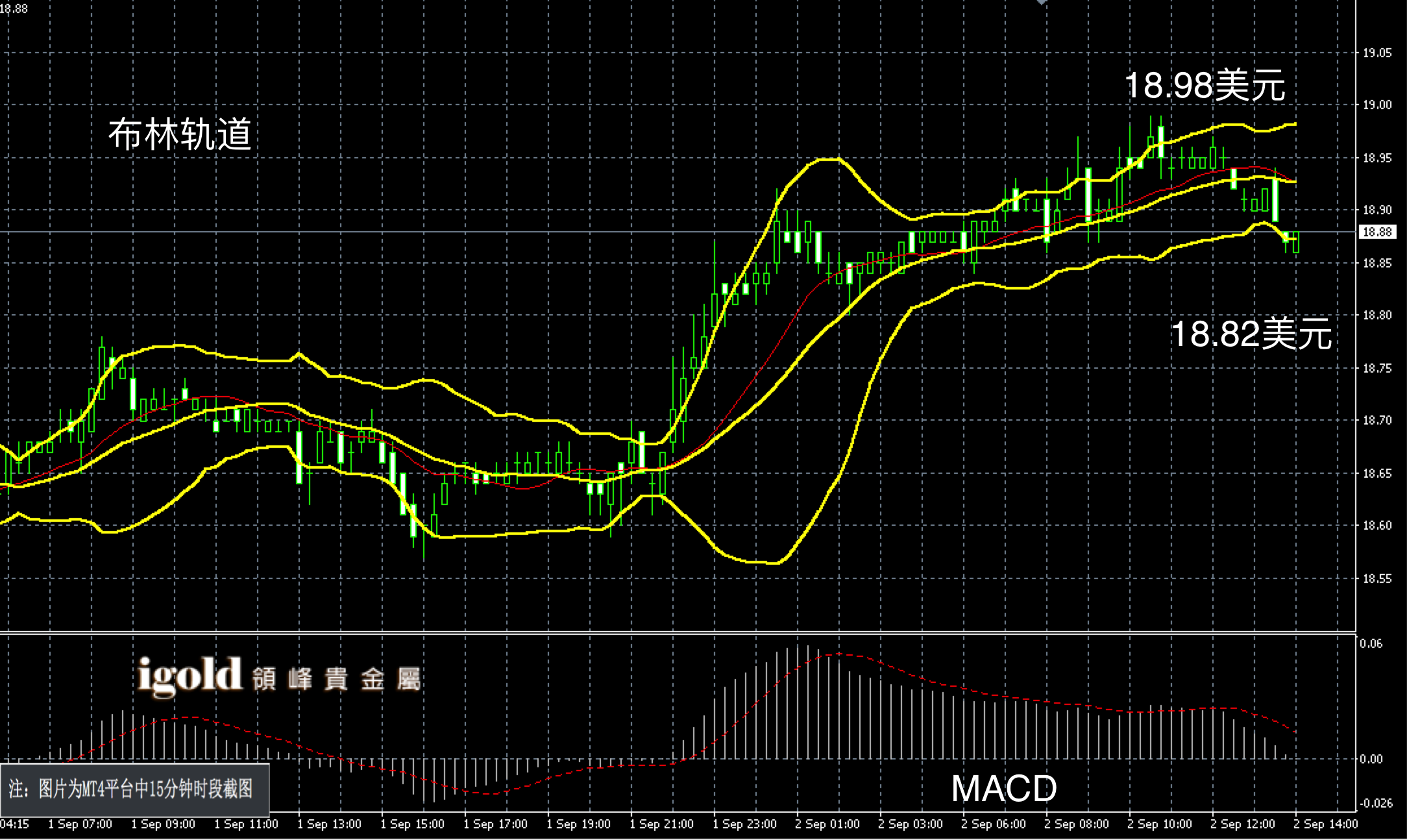 白银短线阴阳烛间隔出现,末端小幅低于红色日均线,MACD显示呈中性,布林轨道区间小幅回调,白银价格下午或在18.9美元附近弱势盘整,高低多空扩大信号可分别参考19和18.8美元附近,白银价格短线多头继续大幅增加的概率较低。