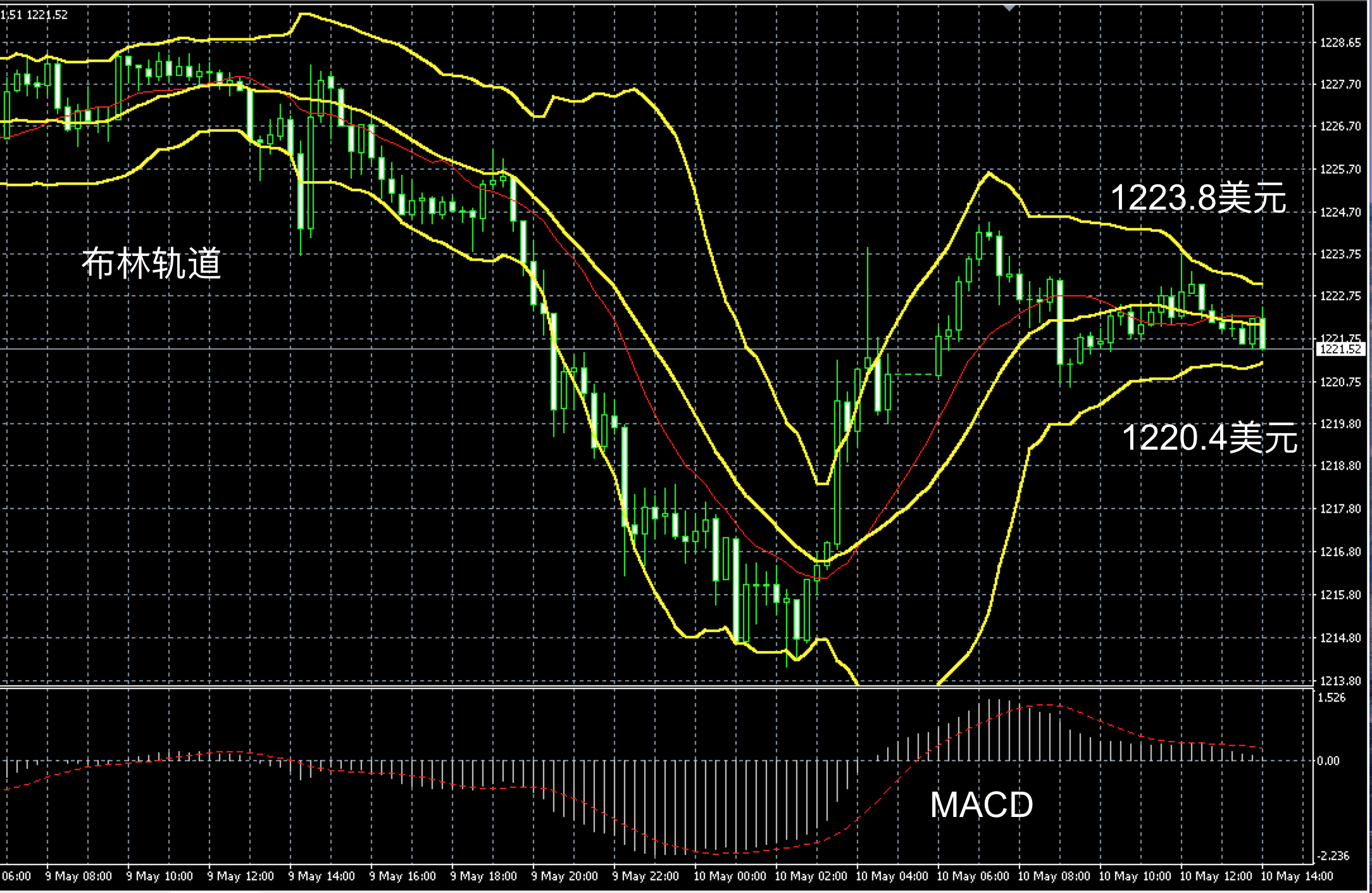 黄金阴阳烛录得反弹后持稳,末端低于红色日均线,短线MACD显示呈中性,布林轨道区间较窄,黄金价格下午或在1222美元附近徘徊,高低多空扩大信号可分别参考1223.8和1219.6美元附近。
