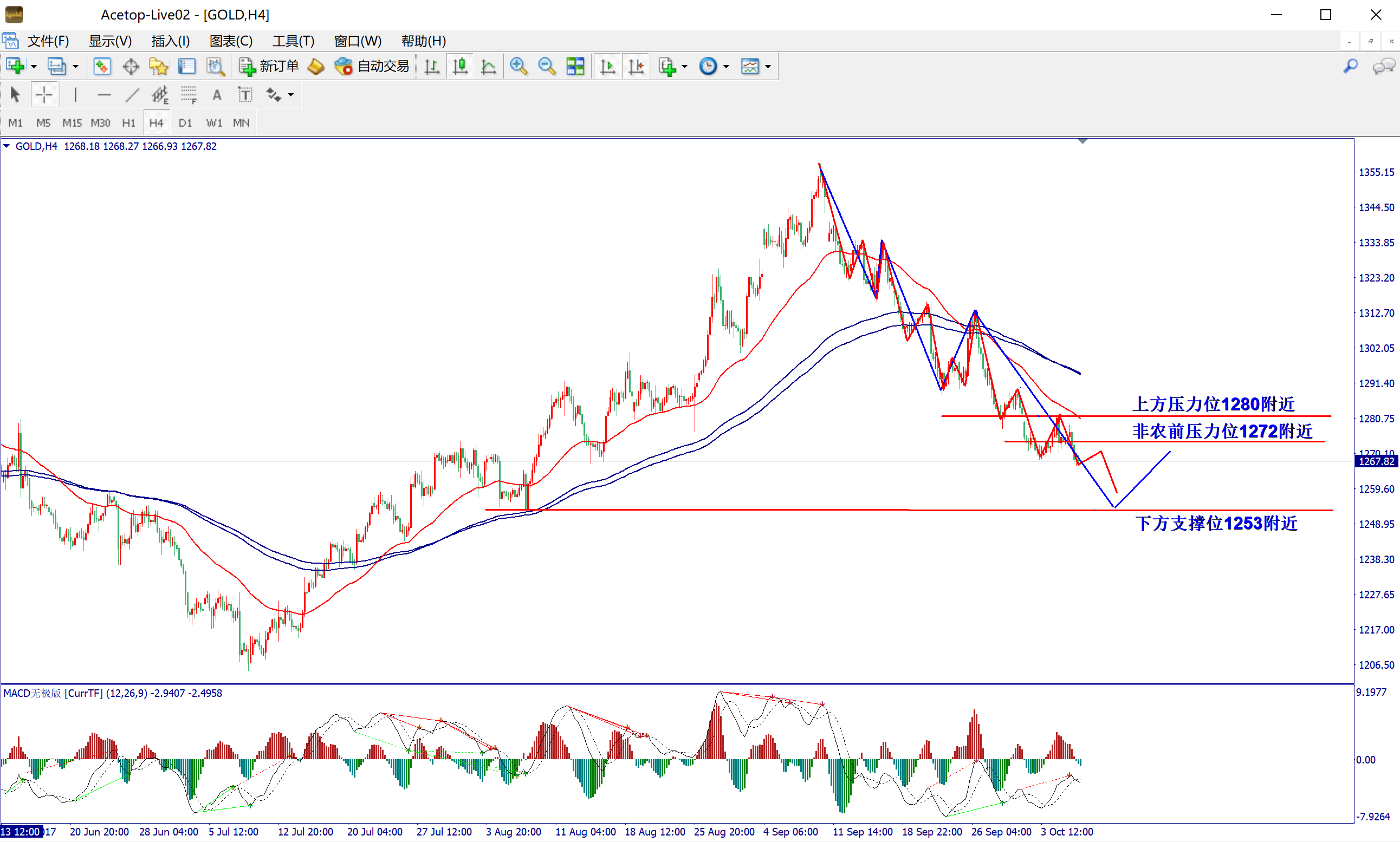 2、非农公布值大于13.8万人,利空黄金,金价有望跌至下方1262、1254支撑位附近。
