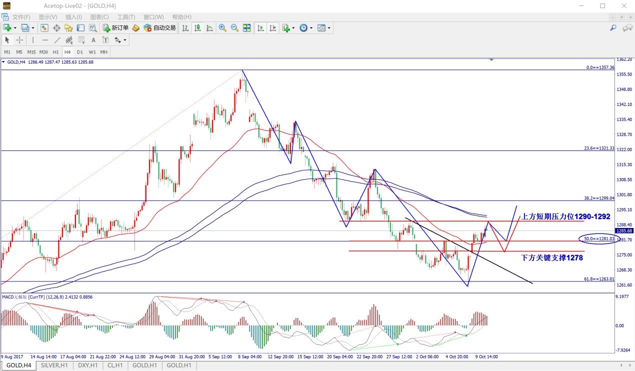 稳健:1281附近做多,止损3美金,目标1284.5-1286-1288-1290附近。