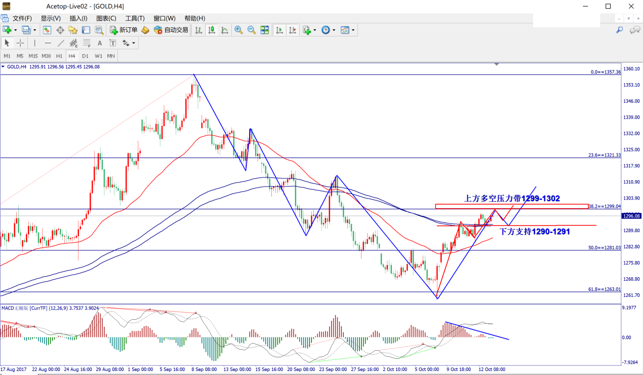黄金日线昨日继续收纺锤小阳线,最高1297.25,最低1289.54,涨幅+0.13%。