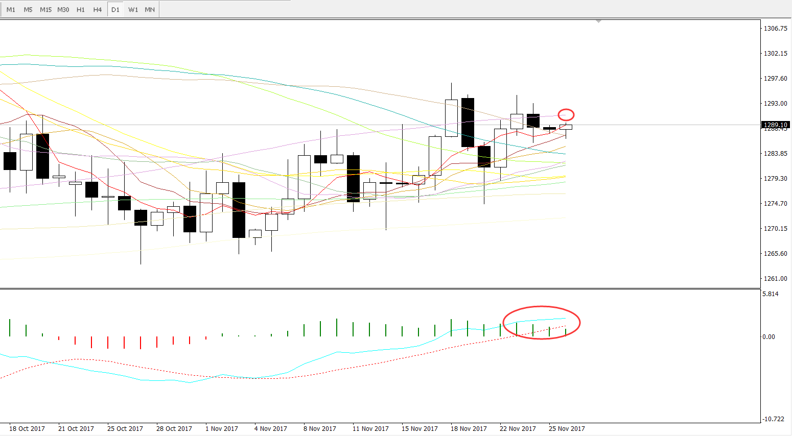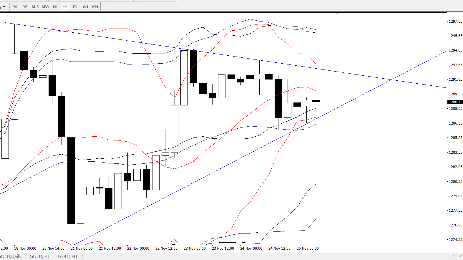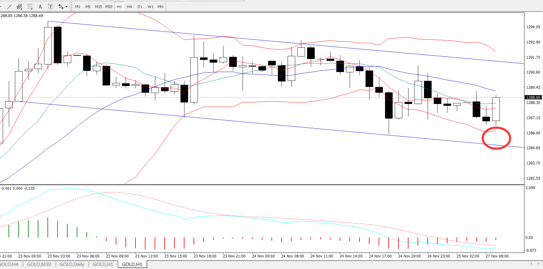 从1小时图来看,目前价格是运行在一个小型的下行通道当中,短线方面重点关注下轨的一个支撑情况,而布林轨的下轨也是刚好在1285-1287区间有一个较好的支撑情况,短线上如果能进一步上行,并有效打破下行通道的运行轨迹,上方空间进一步打开的概率才会加大。