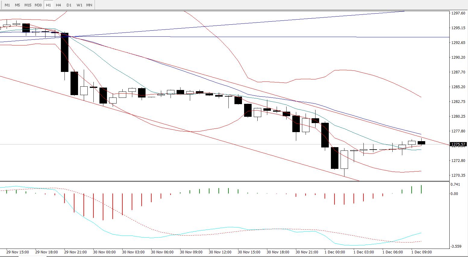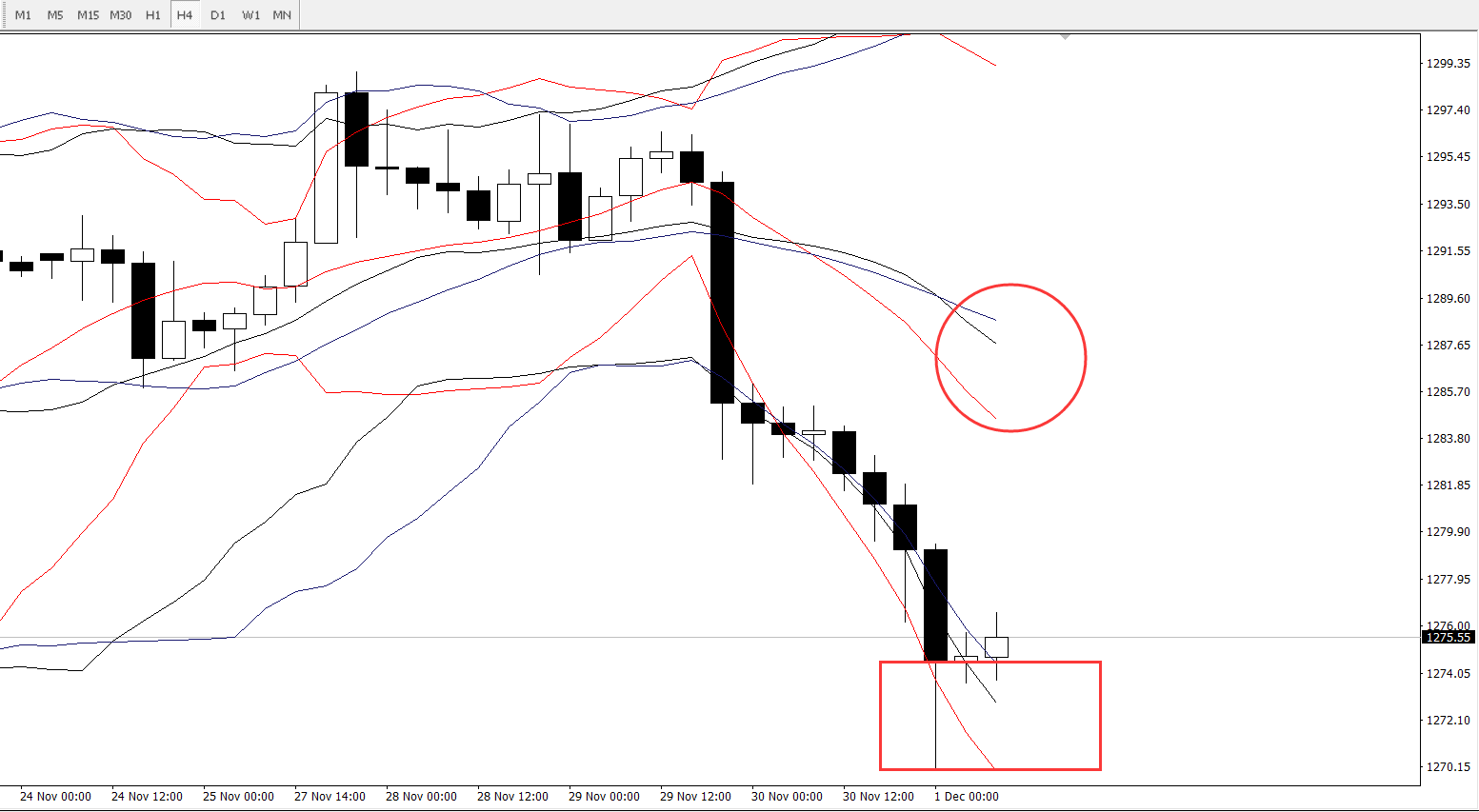 4小时图上看,目前周期分别为142126布林轨的下轨区间1270-1274在短线上有较强的支撑,重点关注这一带的反弹情况,上方关注各周期布林轨的中轨位置。