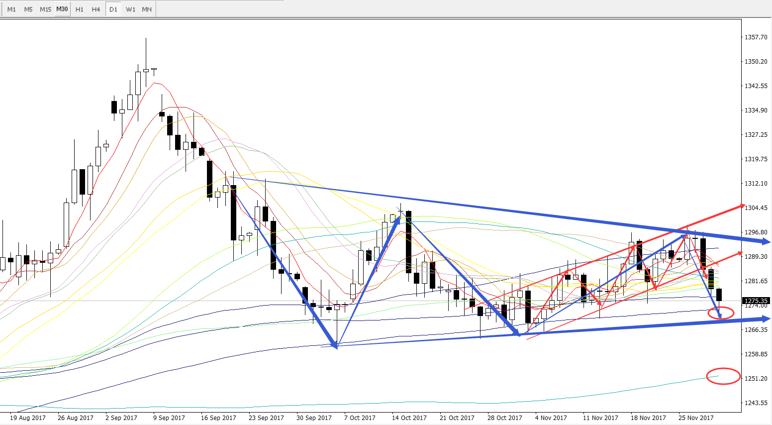 日线图上看价位成功下破日K实体的上升通道之后,昨日是延续下跌的行情。目前价位是成功走到一个更大级别的整理结构的底部位置,同时受到200日均线的有效支撑。这两个强支撑若能有效打破,价格才有可能进一步看到下方300日均线1251美元一线。