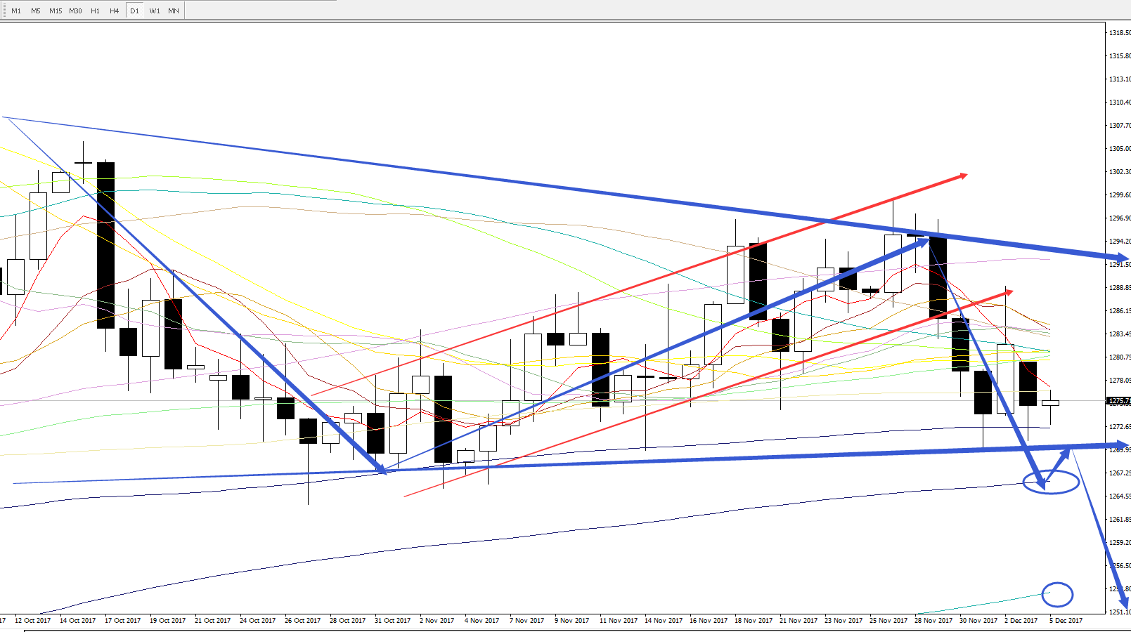 日线图,上周五黄金受基本面的一个推动成功反弹到上一个小级别上升通道的下轨位置后受阻回落,目前价位短线上受支撑于200日均线一线,若有效打破下方要重点关注大级别整理结构下轨一线的支撑情况,下方重点关注250日均线的支撑1266以及300日均线1253美元一线。