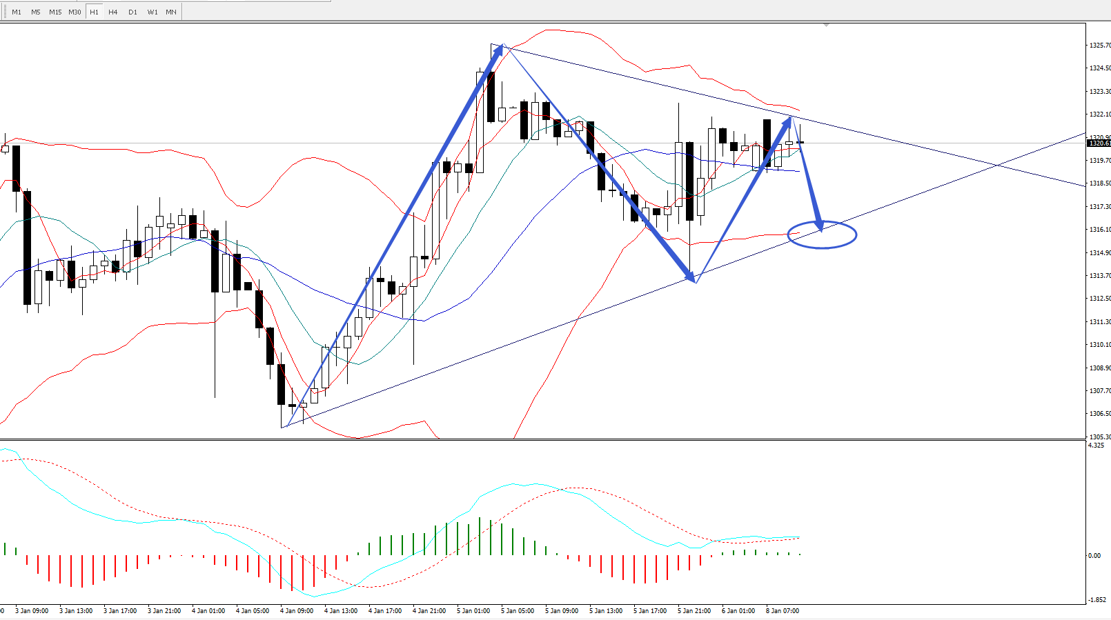 从1小时图来看,目前价格运行于三角整理结构当中,且MACD的快慢线回落到零轴附近,小时线级别布林轨处于收口状态,目前短线价格要重点关注三角整理结构的破位情况,若未能上破,短线上价格或将震荡回落至1316美元附近。