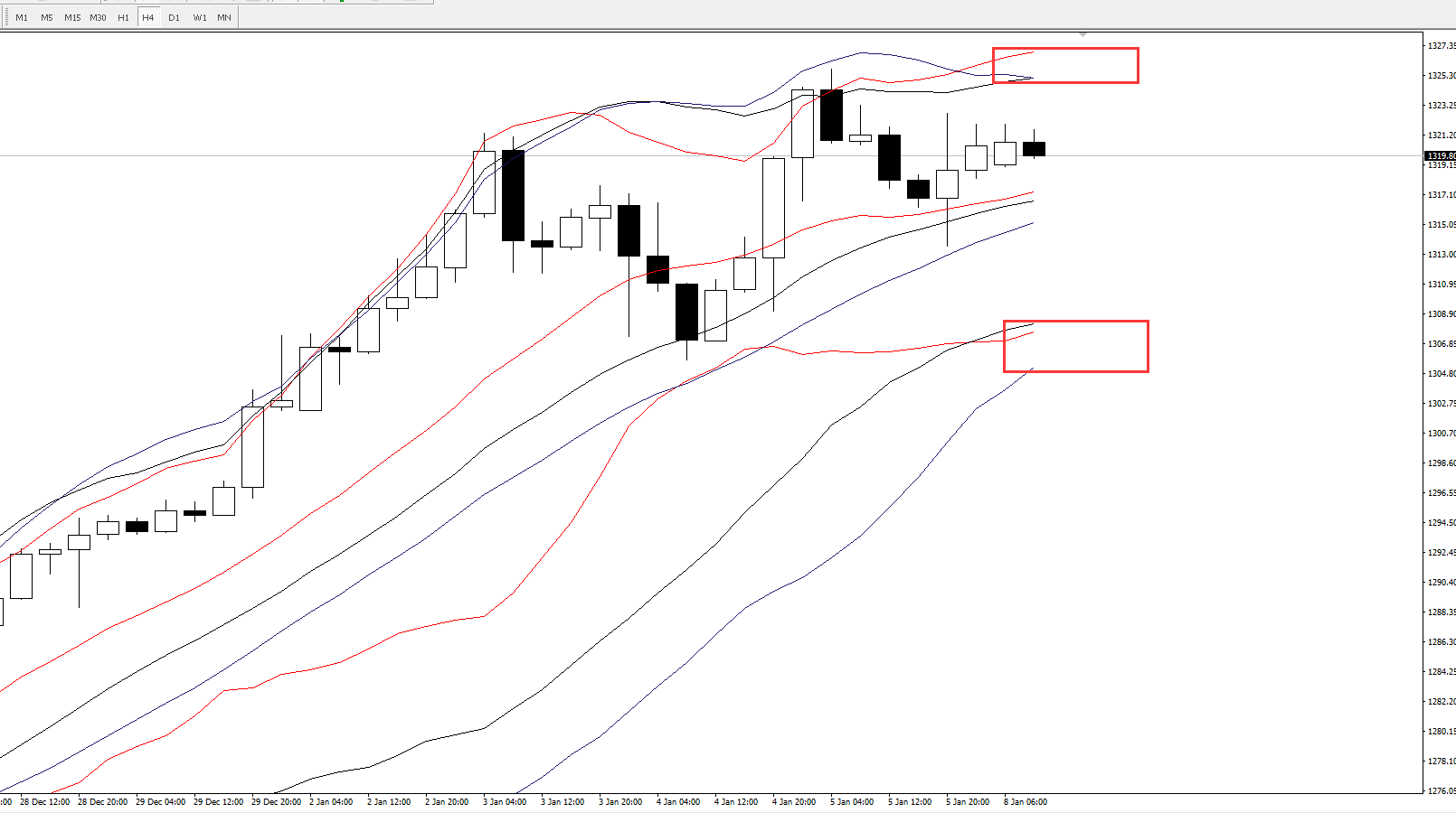 4小时图,目前价格短线上受压于周期分别为14、21、26布林轨的上轨区间1325-1327,短线上要留意各周期布林轨中轨的支撑情况,若继续下破那么下方要重点关注各周期布林轨的下轨区间1305-1308。短线上建议于1305-1327区间高抛低吸,快进快出。