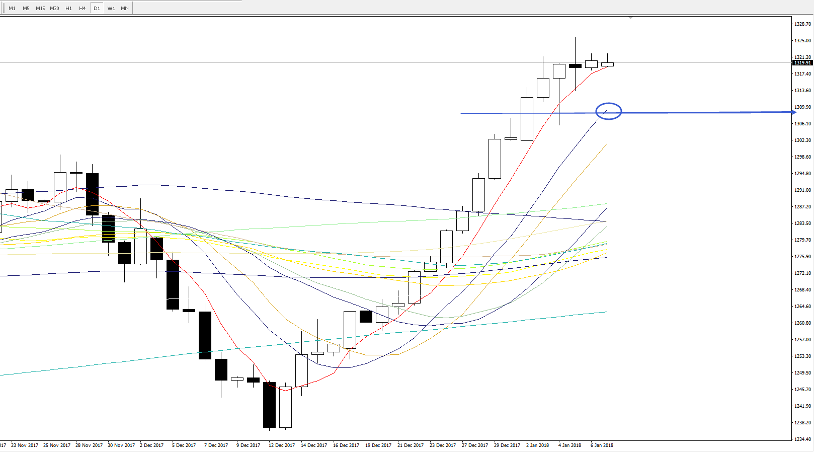 日线图,目前从K形态上来看,有筑顶迹象,短线上则要重点关注5日均线的一个支撑情况,若撑不住,短期内价格或将快速回落至10日均线1309附近。