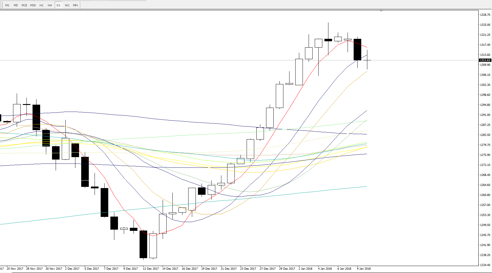 4小时图,目前周期14的布林轨已经开口向下且价格最低打到1308一线,而周期21、26布林轨整体上仍属于走横的一个状态,目前短线上于下轨区间1308-1311一带的支撑较强,需要重点留意。行情日内若出现快速反弹,上方要留意各周期布林轨中轨位置区间1316-1318的压制情况。