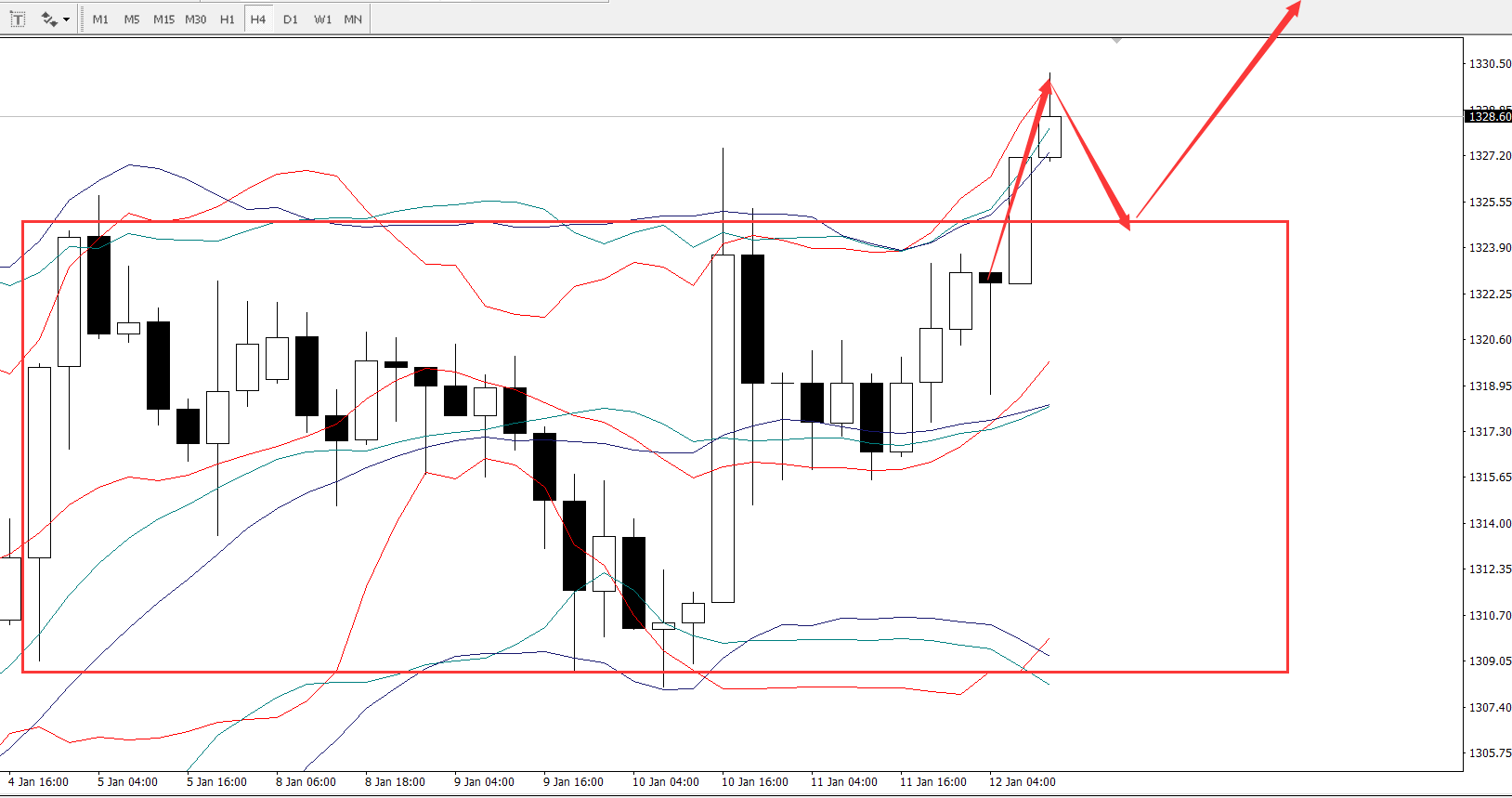 4小时图,目前周期14、21、26布林轨整体上原本同时走横的一个状态已经被破坏,目前不同周期上轨同时上扬。且从K线上也能直接看出4小时级别的箱体已经被价格有效上破,短线上要重点关注价格的回落力度,日内短线操作上尽可能逢低做多。下方要重点关注中轨区间1318-1320一带的支撑情况。