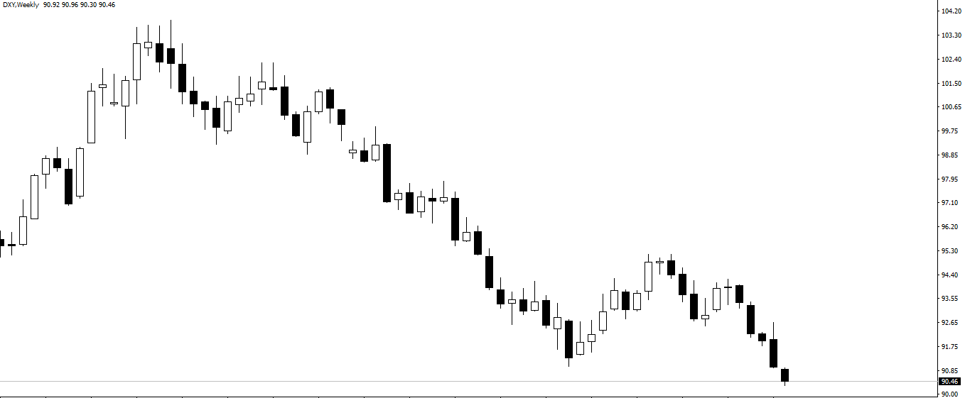 周线图显示,美元指数继2017年末跌破重要支撑关口93.00后,不到两周时间已经下破了去年低点91.00;从周线图发出的信号来看,未来美元指数可能将进一步走弱,而90.00关口附近的支撑作用值得密切关注。美元指数一旦跌破90关口,或将向89重要心理关口下行;若突破91去年9月低点的阻力位,则有望反弹至92关口。