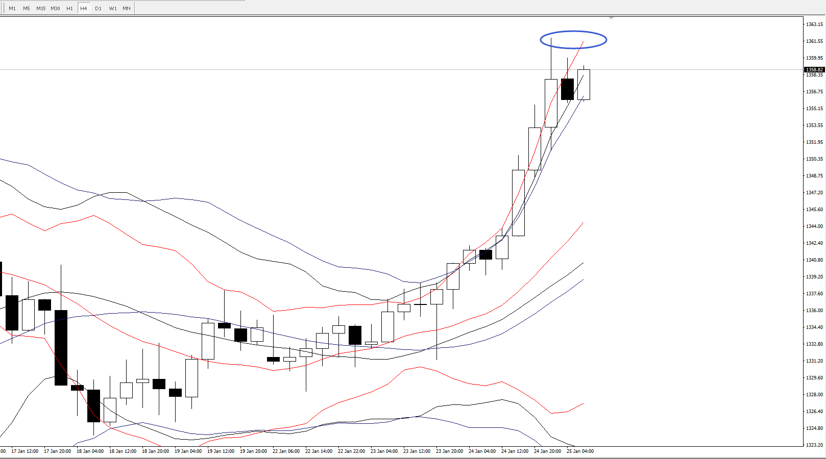 4小时图,亚欧盘短线上要重点关注上一根4小时出现的长上影的高点位置1362这一线的压力情况,该位置也是周期14布林轨的上轨位置,该位置若被强力上破,上方空间仍将进一步被打开。下方重要支撑位要留意周期14布林轨的中轨位置1344.5一线。稳健者亚欧盘建议以观望为主,等美盘节奏明快后再去轻仓介入。