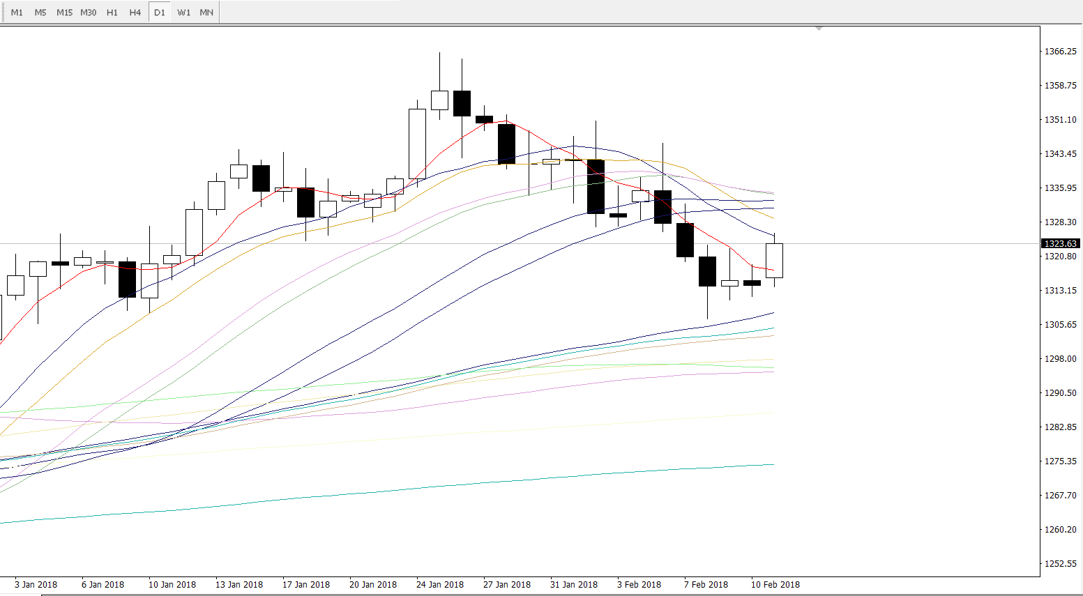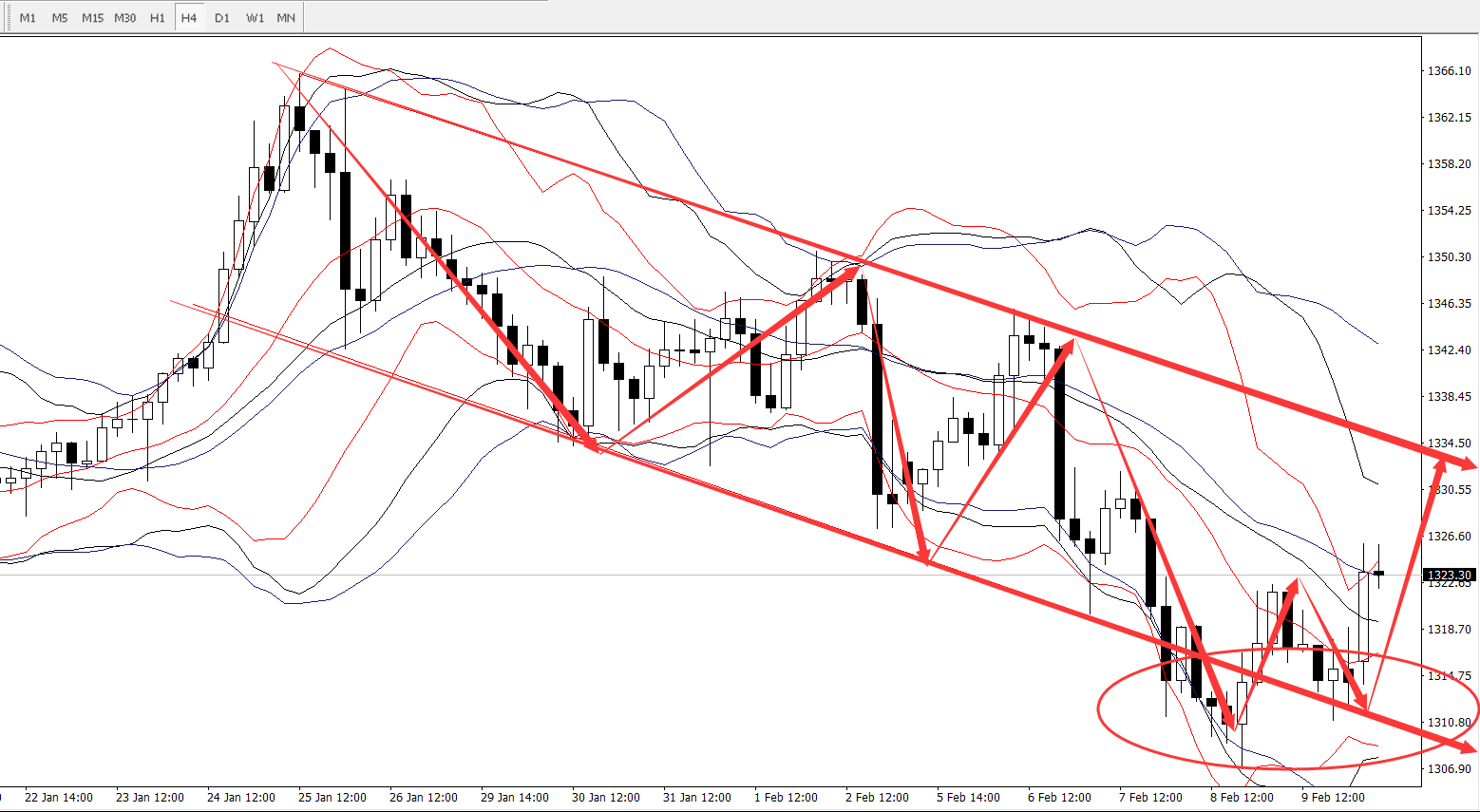 日线图,目前从K线上来看,日线级别已经有在做阶段性底部的迹象,若今天的日K能收一根较为饱满的阳K,那么近期黄金多头在春节前或将进一步发力。短线上当前价格受压于10日均线1325一线,短线上价格若能回踩5日均线1318附近,短线多单建议果断分批入场,上方要重点关注的是20日均线与22日均线的交叉点1335,该位置也是4小时下行通道的压力位。若有低位多单建议到达该位置进行适当的减仓,保护盈利。