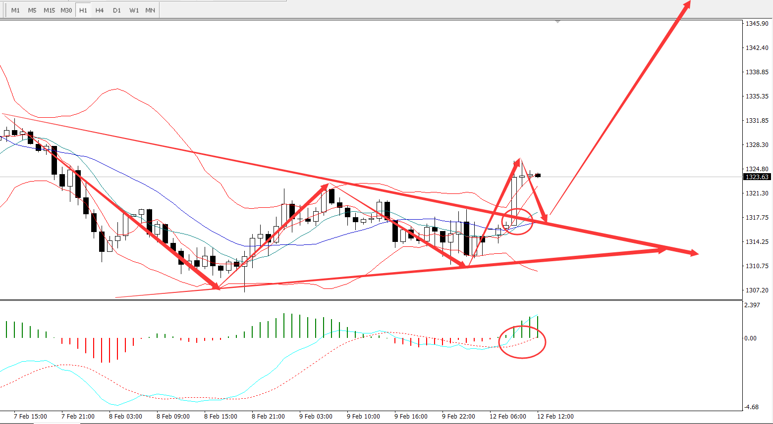 1小时图来看,目前价格于已经成功上破前期的三角整理结构,且量能在进一步的快速释放当中,当前布林轨也已经成功向上开口,价格站稳于布林轨中轨上方,短线上均线系统再次出现底部金叉,且MACD快慢线与柱体也已经成功上穿零轴,短线整体上是明显的多头趋势,亚欧盘建议以逢低做多为主。