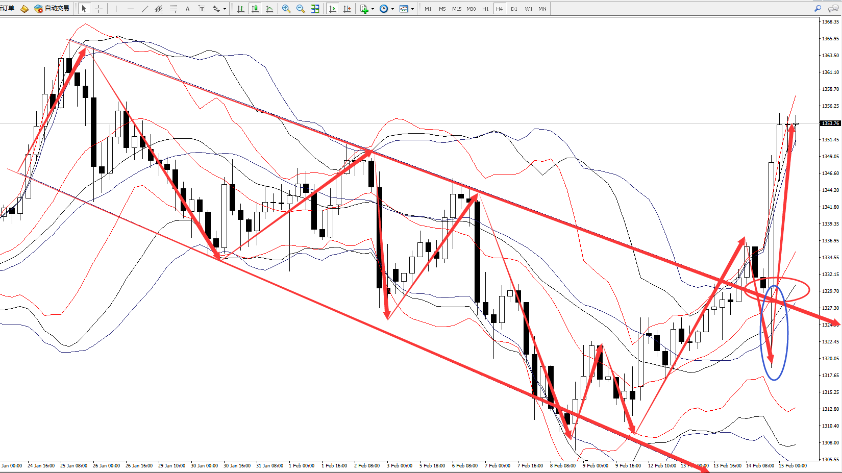 黄金于昨日出现了一波非常刺激的行情,亚盘小副冲高后于欧盘震荡回落,而到晚间美盘受基本面21:30公布的美国通胀数据强于预期的影响,使得金价快速跳水,最低触及1318.7一线,随后快速拉升并于凌晨录得新高1355.2美元,从技术面上我们能清楚地看到当时行情于美盘收出了一根带有长下影线的4小时大阳K,这类走法可以认定是黄金多头主力在走出4小时下行通道后于大涨前的一次粗暴的洗盘动作。日内要重点关注晚间美盘时段的行情节奏,届时21:30将公布美国截至2月10日当周初请失业金数据,行情或将被再次掀起波澜,建议投资者控制好风险。