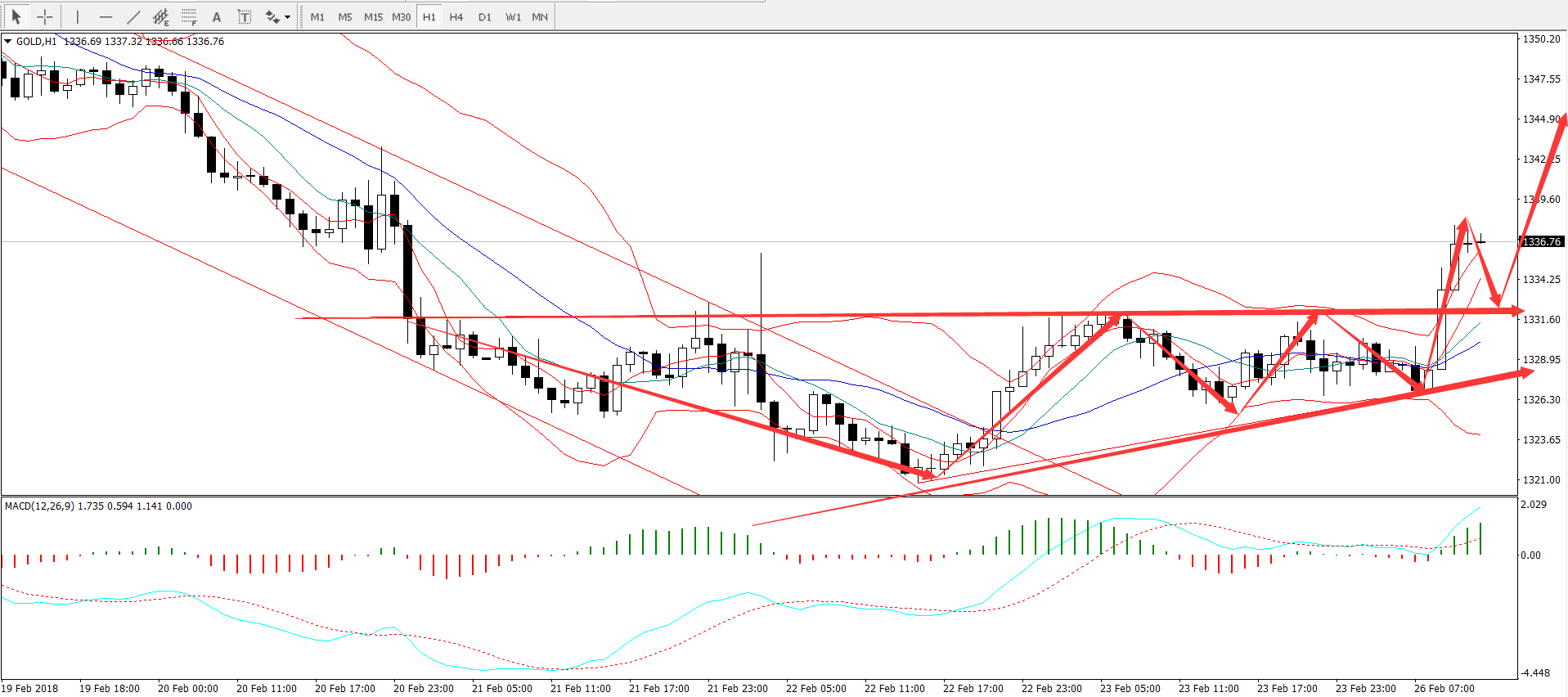 从1小时图来看,目前短线上价格已经成功向上走出小级别楔形整理结构,当前布林轨小幅收口后已经重新向上开口,且当前短线价格沿着布林轨上轨持续走高。短线均线系统再次出现金叉,MACD的快慢线与柱体也已经重新同时上穿零轴,短线上整体偏多,但日内要关注短线的一个回踩力度,特别是楔形整理结构的上轨支撑位1332一线附近需重点留意,所以稳健者于亚欧盘建议整体上以轻仓低多为主。