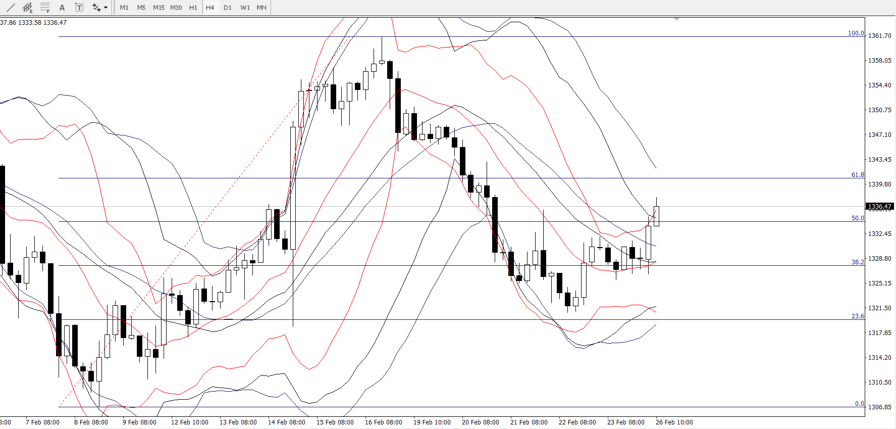 4小时图,短线上价格于上周在斐波纳23.6%回调位附近形成有效支撑,并收出了非常漂亮的向上吞没形态后,一路震荡上行并成功上破斐波纳38.2%回调位与50%回调位,当前要重点关注斐波纳61.8%回调位1340一线附近的压力。而布林系统要重点关注周期分别为14、21、26布林轨的中轨支撑区间1328.5-1330.5,同时上方要重点关注周期26布林轨上轨压力位1342一线的压力情况。稳健者日内建议于1328.5-1342区间轻仓进行高抛低吸。