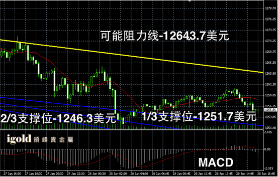 黄金阴阳烛录得后期柱体低于红色日平均移动线,短线MACD显示弱势空头主导,后期柱体开始持稳,整体黄金价格或在1250 – 1270美元区间内偏空整理。