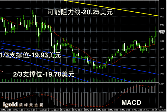 白银阴阳烛录得小幅持稳后,U型反弹,后期柱体小幅高于红色日平均移动线,短线MACD显示弱势多头主导,白银价格或继续小幅反弹,整体则持稳在20美元以上。