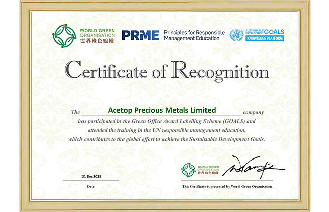 放大图1-领峰贵金属长期实践环保责任,荣膺世界绿色组织「10+绿色办公室」大奖