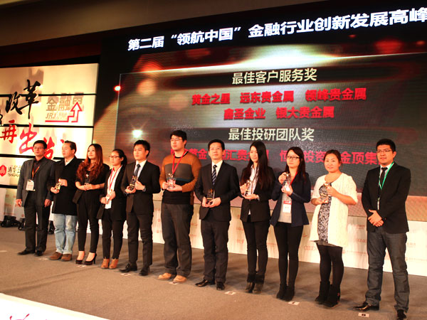 2014年1月9日,由金融界、清华大学五道口金融学院主办的“2013领航中国金融行业年度评选”活动在北京威斯汀大酒店完美落幕,领峰贵金属在本届活动中荣获“最佳客户服务奖”。
