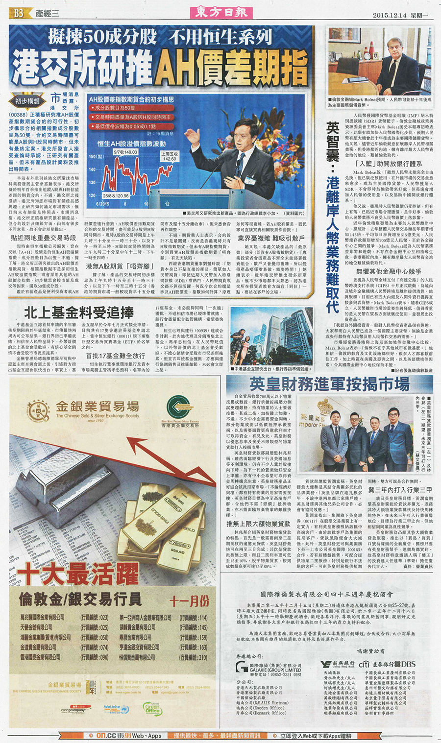 2015年12月14日,金银业贸易场于东方日报公布了今年11月份“十大最活跃伦敦金/银交易行员”名单,领峰贵金属从百余家优秀行员中脱颖而出,荣获2015年11月份「最活跃伦敦金/银交易商」称号,再次获得广大客户的肯定及监管机构金银业贸易场的认可。