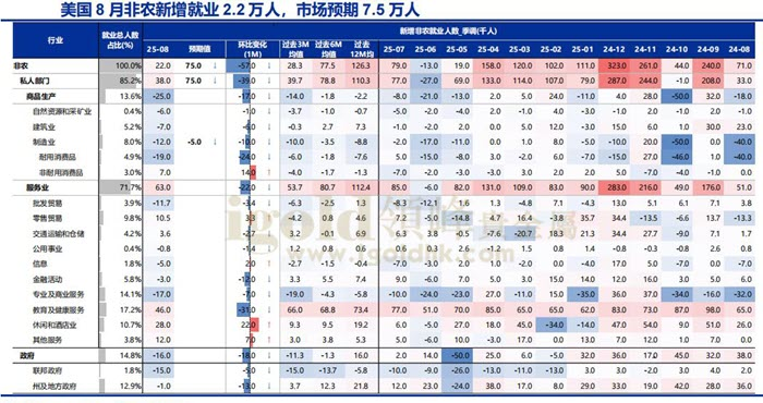 多数行业就业出现恶化,周期不敏感行业走弱尤为显著。8月私人部门新增3.8万人,政府部门减少1.6万人,均弱于7月。私人服务业中,教育卫生业在8月仅新增4.6万人,较7月的7.7万人大幅放缓;8月商品生产行业就业减少2.5万人,其中制造业、建筑业分别减少1.2万人、7000人,均较7月恶化,或反映关税冲击;从另一角度看,8月周期敏感性行业就业减少4.8万人,降幅较上月扩大2.6万人。周期不敏感行业虽新增2.4万人,但增幅较7月放缓5.2万人。政府、教育卫生业就业的走弱,反映了特朗普将就业从“政府”驱动转回“市场”驱动的导向。