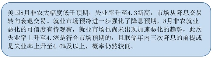 美国8月非农就业大幅低于预期,失业率升至4.3%新高。机构调查方面,美国8月非农新增就业2.2万人,市场预期7.5万人。8月私人部门新增就业3.8万人,市场预期7.5万人。8月平均时薪环比0.3%,符合市场预期;家庭调查方面,8月失业率升至4.3%,符合市场预期,劳动参与率上升至62.3%。6月新增就业被下修2.7万人至-1.3万人(负增长),而7月新增就业被小幅上修6000人至7.9万人。
